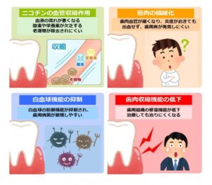喫煙は歯周病の最大のリスク因子です。タバコは歯ぐきの血流を悪くし、炎症に気づきにくくなります。治療効果も下がるため、歯周病予防を考えるなら禁煙・減煙はとても重要です。