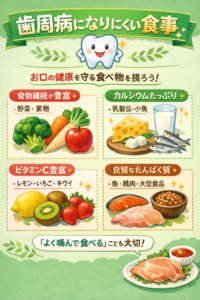 「歯周病予防は毎日の食事から。よく噛み、栄養バランスを整えることで健康な歯ぐきを保ちましょう。」