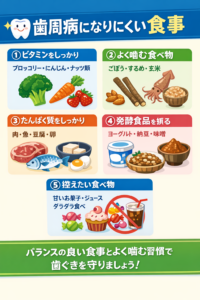 「歯周病予防は毎日の食事から。よく噛み、栄養バランスを整えることで健康な歯ぐきを保ちましょう。」